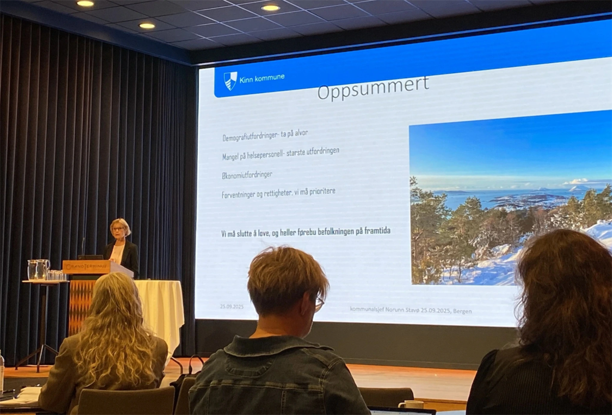 Norunn Stavø presenterer Kinn sitt arbeid med rekruttering i helse og velferdKommuneindeksen set saman indikatorar og statistikk frå alle tenesteområde, og vurderer Kinn kommune mot andre. Kommunen blir invitert av andre for å gje informasjon om rekrutteringsarbeidet til helse- og velferdssektoren, og er såleis teke fram som ein føregangskommune på dette område.