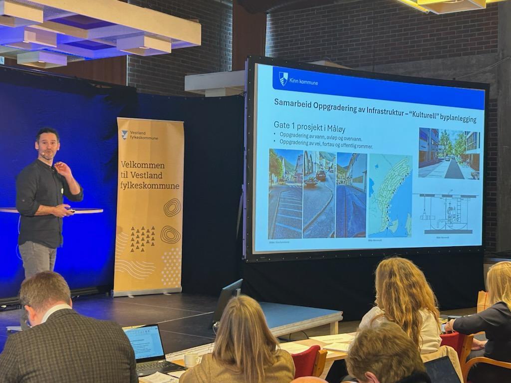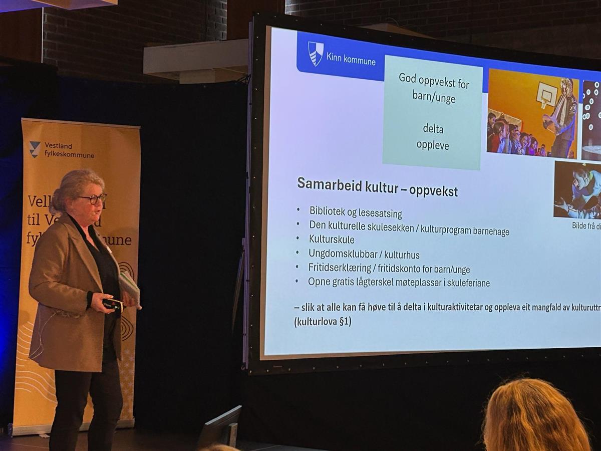 Kulturkonferansen er i gong på Florø kulturhus!Lytt til tekstenStopp avspillingVestland fylkeskommune arrangerer i år Kulturkonferansen på Florø kulturhus, der deltakarar frå heile regionen samlar seg for å utforske korleis kultur kan løftast som politikkområde og kraft i samfunnsutviklinga.Ordførar Bengt Solheim-Olsen opna konferansen og ønskja alle deltakarane velkomen, før Jacob Nødseth tok over ordet, i rolla som leiar i hovudutval for kultur, idrett og inkludering i Vestland fylkeskommune.Programmet for dagen rettar seg mot tre ulike tema:Korleis løfte kultur som politikkområdeKulturpolitikk i praksis – samarbeid om gode lokalsamfunnKorleis løftar vi i lag?Midt på dagen gjekk ein panelsamtale leia av Jacob Nødseth føre seg, der mellom anna ordførar Bengt Solheim-Olsen, Øyunn Viken og dagens innleiarar diskuterte korleis god kulturpolitikk kan bidra til sterke og berekraftige lokalsamfunn.Kultursjef Anita Solbakken fortel om samarbeidet mellom kulturavdeling og oppvekstsektorVår eigen kultursjef Anita Solbakken, i lag med avdelingsleiar Jorunn Bakke Nydal og prosjektleiar for Gate 1-prosjektet Juan Diaz, presenterer også korleis vi samarbeider om kultur og stadutvikling i Kinn kommune.Prosjektleiar Juan Diaz fortel om Gate 1-prosjektet i Måløy og kulturell byplanleggingDagen rundar av med fokus på samarbeid mellom offentlege aktørar og private stiftingar. Sparebankstiftinga Sogn og Fjordane og Gjensidigestiftelsen presenterer døme på vellukka kulturprosjekt, før ein avsluttande panelsamtale undersøker korleis ein i fellesskap kan løfte kulturlivet vidare.Du kan lese meir om Kulturkonferansen 2025 på Vestland fylkeskommune si heimeside. Publisert 18.11.2025 13.17 Sist endra 18.11.2025 13.41