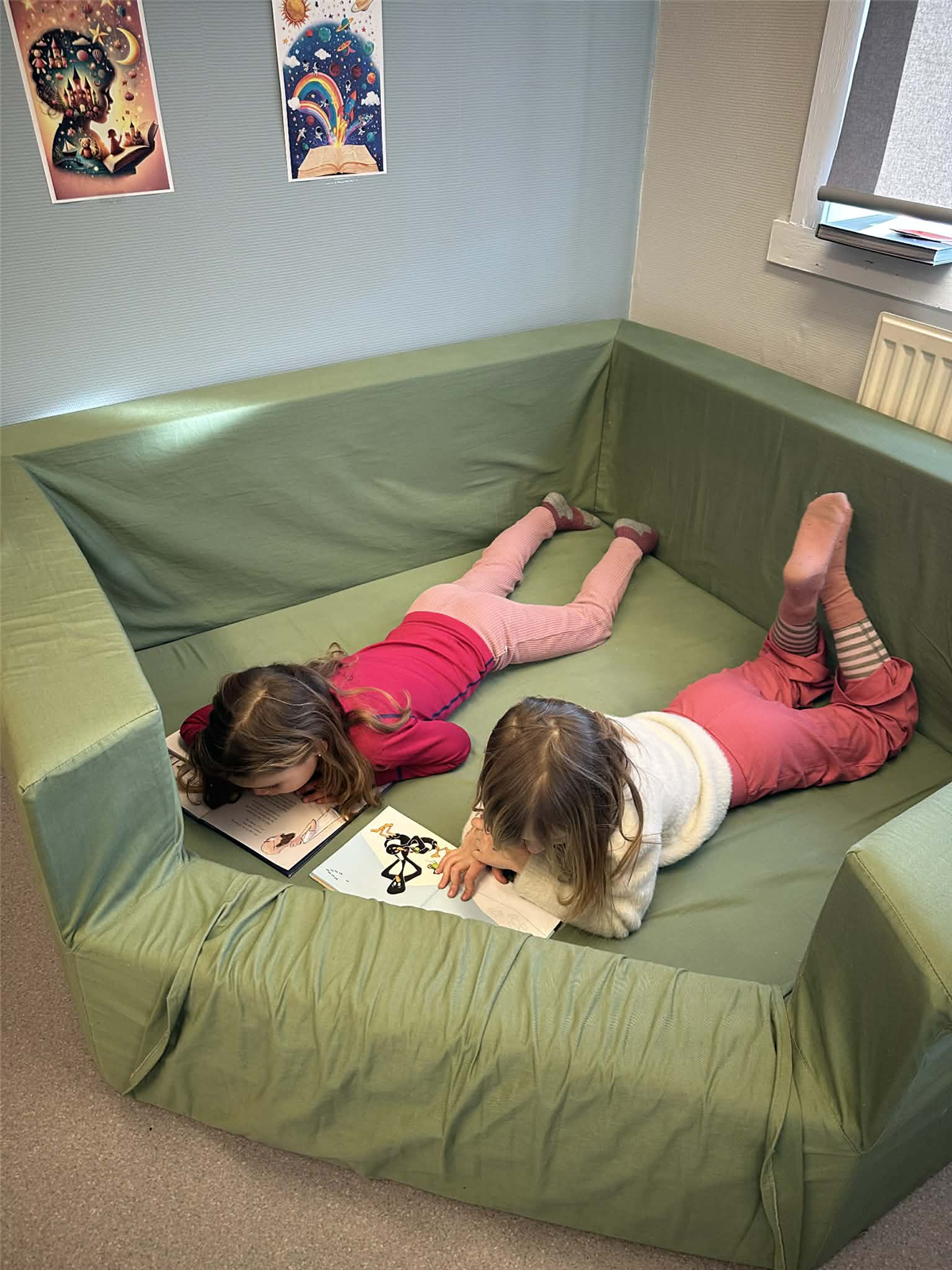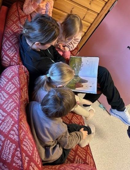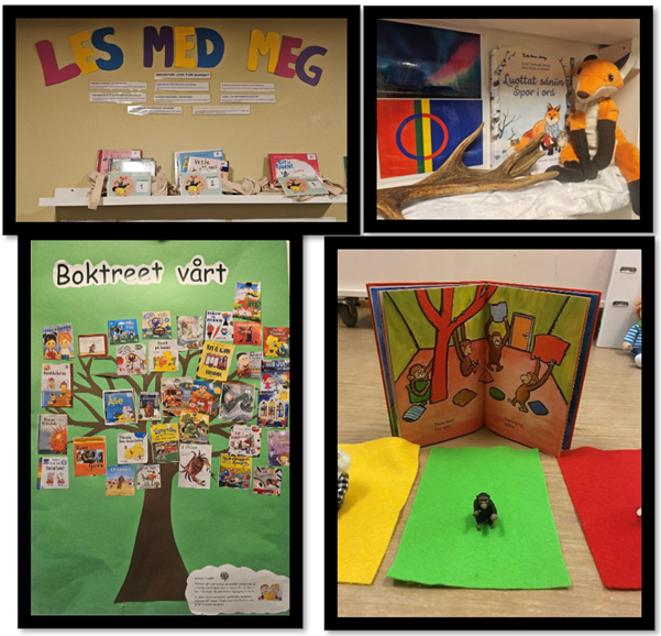 Barna viser ivrig kva bøker dei likar, og fortel kva bøkene handlar om. Bøker som blir lest mykje ser vi igjen i leiken. I samarbeid med biblioteket tilbyr vi utlån av bokposar, noko som er veldig populært. Boka har ein stor plass i kvardagen vår.