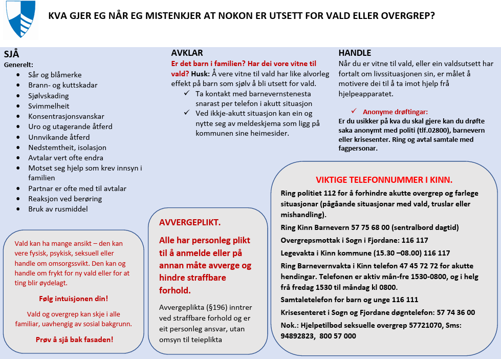 Mistenkjer du at nokon ikkje har det bra heime?Lytt til tekstenStopp avspillingEr du sjølv utsett for vald eller seksuelle overgrep, eller kjenner du nokon som du veit eller mistenker blir utsett for det? På denne sida finn du meir informasjon om kva du kan gjere og kven du kan ta kontakt med. Du kan òg lese meir om kva vald og seksuelle overgrep er, og kva det kan gjere med dei som blir utsett for dette. Treng du nokon å snakka eller rådføre deg med, kan du kontakte psykisk helse og rus. Her kan du sjå eit enkelt handlingsark for korleis du skal handle om du ser nokon bli utsett for vald eller seksuelle overgrep.Kva gjer du når du mistenker at nokon er utsett for vald eller overgrepAvverjepliktAlle har ei personleg plikt til å melde eller på annan måte avverje og hindre alvorlege brotsverk Vald og overgrep?Akutt hjelpViktige telefonnummerPoliti: 112 eller 02800Krisesenteret Sogn og Fjordane: 57 74 36 00Legevakt/overgrepsmottak: 116 117Barnevernvakt: 57 75 68 00 (dagtid), 47 45 72 72 (mellom 15.30-8.00 og helg)Ring politiet ved fareVed alvorlege trugslar eller fysisk skade: ring 112.Legevakt og overgrepsmottakRing legevakt eller overgrepsmottak på 116 117 for undersøking og sporsikring.Ikkje dusj eller vask kroppen før undersøkinga.Ved halsgrep eller kveling bør du alltid oppsøke lege.Krisesenteret Sogn og FjordaneDu kan kontakte Krisesenteret Sogn og Fjordane på 57 74 36 00 for støtte og hjelp.Tryggleik her og noSpør deg sjølv: Er du, eller den som er utsett, trygg?Vurder kva du kan gjere for å vere trygg fram til du får hjelp.Når det gjeld barnPlikt til å hindre vald og overgrep mot barnDu har plikt til å hindre vald og overgrep mot barn dersom du har grunn til å tru at eit barn blir, eller kan bli, utsett.Situasjonar som kan vere teiknFysiske skaderTeikn på psykisk valdAlvorlege trugslarMistanke om seksuelle overgrepBarnet er redd for å gå heimBarn blir henta av foreldre som er rusa, eller er åleine heime med rusa foreldreMistanke om kjønnslemlesting eller tvangsekteskapBarnet fortel sjølv om det har opplevd vald eller overgrepKven skal varslast?Varsle politiet så snart som mogleg.Varsle barneverntenesta eller barnevernsvakta.Ved synlege skader: ta bilete om mogleg, og vurder om barnet må til lege for å sikre bevis.Viktig: Dersom det er mistanke om vald eller overgrep mot barn, skal ikkje foreldra varslast.Er du utsett for vald eller overgrep?Gratis og døgnopen hjelpVurderer du å bryte ut av ein valdeleg relasjon, eller har du allereie gjort det? Du kan ta direkte kontakt med kommunen sitt krisesentertilbod: Krisesenteret Sogn og Fjordane tlf. 57 74 36 00.Tilbodet er gratis.Du treng ikkje tilvising eller avtale.Krisesenteret er ope heile døgnet.Kva du kan få hjelp tilKrisesentertilbodet gir:Støtte og praktisk hjelpRåd og rettleiingHjelp til bearbeidingInformasjon om rettar og moglegheiterAdvokatbistandFormidling av kontakt med offentlege instansarMellombels butilbod i trygge omgjevnaderTryggleik og anonymitetKrisesenteret har teieplikt.Du kan vere anonym.Det er mogleg å ta kontakt for ein uforpliktande samtale.Viktige telefonnummerKrisesenteret Sogn og Fjordane: 57 74 36 00.Legevakt og overgrepsmottak: 116 117.Meir informasjonBesøk overgrep.no eller les meir hjå Krisesenteret Sogn og Fjordane si heimeside. Kva gjer eg ved mistanke om vald eller seksuelle overgrep mot barn?Kven kan dette vere aktuelt for?Denne informasjonen er for deg som til dømes ernaboforelder i klassenbesteforelderspeidarleiarfotballtrenareller har ein annan relasjon til barnetKva skal du gjere?Dersom du er uroa for, eller trur at eit barn blir utsett for vald eller seksuelle overgrep: kontakt politiet eller barnevernet/barnevernsvakta.Er du usikker? Du kan drøfte anonymt med desse tenestene først. Politiet eller barnevernet vil gi deg råd om kva du bør gjere vidare, og om saka er så alvorleg at du må melde frå.Teikn du kan sjå etter ersår og blåmerke på uvanlege stader på kroppenbrann- eller kuttskadarsvimmelheitsøvn- eller spiseproblemmagesmerter eller hovudpineuro, irritabilitet eller tristheittilbaketrekking, utagerande eller «pleasande» åtferdreaksjonar ved berøringhyppige legebesøk eller innleggingar på sjukehus utan klare symptomforeldre som motset seg innsyn i familiensjølvskadingbruk av rusmiddeldårleg tannhelseskjulte bodskap i barnet si åtferd eller snakkKorleis snakke med barnetBruk barnet sine eigne ord.Ver nysgjerrig og utforskande – ikkje krev detaljar.Start gjerne med observasjonar:«Eg har lagt merke til at du ofte har vondt i magen.»«Eg ser du verkar trøytt og trist.»«Du har blåmerke på armen.»Tips når du spørGjenta det barnet seier.Unngå leiande spørsmål – still opne spørsmål.Bruk støtteord: «hmm…», «ja, fortel», «fortel meir».Sei gjerne fleire gonger: «Eg er her», «kom innom om du vil snakke med meg».Avtal eit nytt møte med barnet.Bruk tid og pausar i samtalen.Når barnet fortelBekreft at det barnet har sagt er viktig.Sei at du må dele informasjonen med andre vaksne for å hjelpe.Avtal gjerne med barnet korleis informasjonen blir delt, og spør om barnet vil vere med på samtalane.Hugs: det er politi eller Statens barnehus som gjennomfører avhøyr – ikkje du.DokumentasjonSkriv ned det barnet har fortalt, så ordrett som mogleg.Noter kven som har sagt kva: «Mor seier …», «Barnet fortel …».Dokumentasjon er viktig.Kven kan du drøfte saka med?Barnevernet/barnevernsvaktaKrisesenter VestPolitietHandlingsarkHer finn du informasjon om kva du kan gjere ved mistanke om vald eller seksuelle overgrep mot barn (PDF, 159 kB).Kva gjer eg ved mistanke om vald eller seksuelle overgrep mot vaksne?Kven kan dette vere aktuelt for?Denne informasjonen er for deg som til dømes erfamiliemedlemvenkolleganaboDu kan sjå etter teikn somsår og blåmerkebrann- eller stikkskadarsvimmelheitkonsentrasjonsvanskarsøvn- eller spiseproblemuro eller utagerande åtferddepresjon eller irritabilitetendra åtferd eller m
